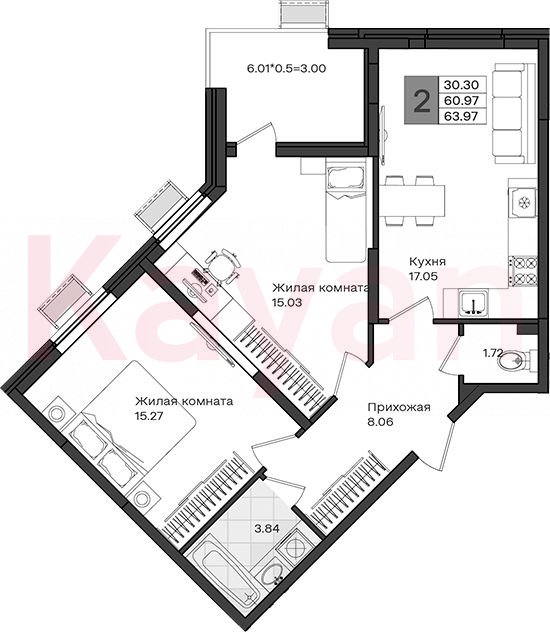 Продажа 2-комн. квартиры, 60.97 кв.м