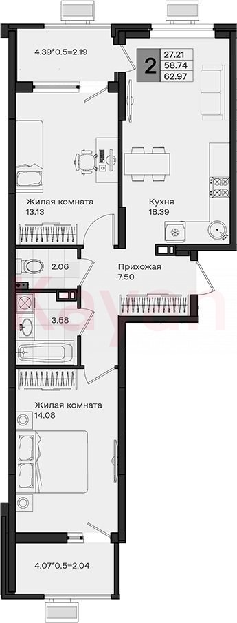 Продажа 2-комн. квартиры, 58.74 кв.м