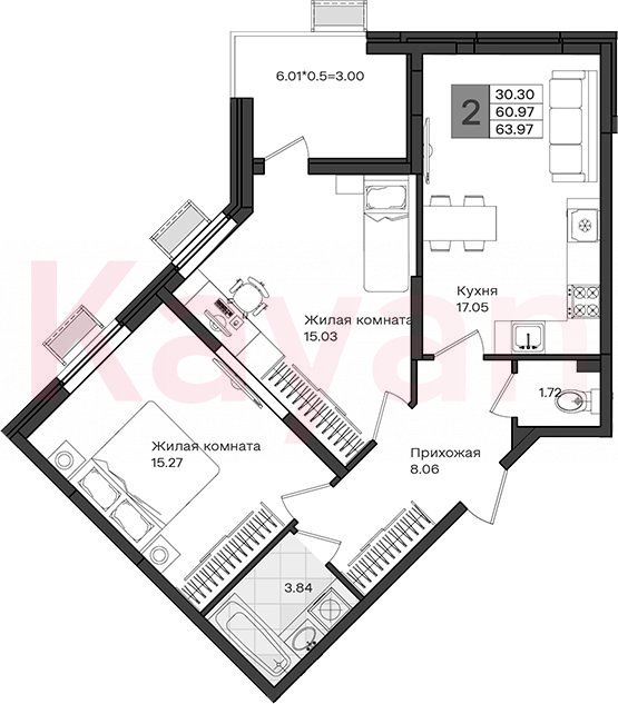 Продажа 2-комн. квартиры, 60.97 кв.м