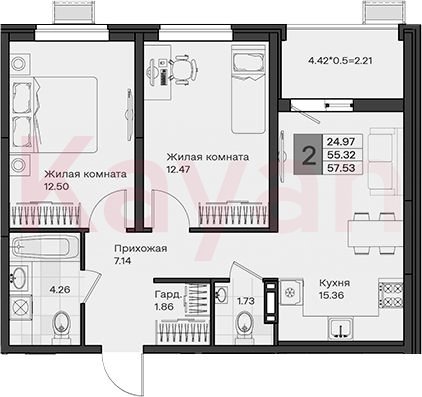 Продажа 2-комн. квартиры, 55.32 кв.м