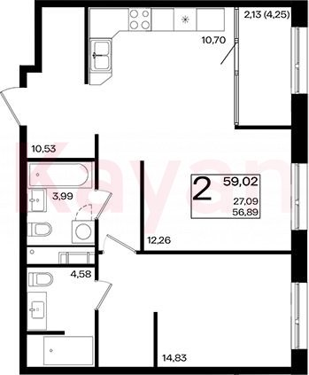 Продажа 2-комн. квартиры, 56.89 кв.м