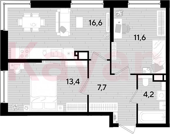 Квартира в ЖК «Dogma park (Догма парк)» (DOGMA. Краснодар) литер 36 очередь 3, Кирпично-монолитный, 2 к.кв., 53.5 кв.м., 11/16, высота потолков: 2.72 м, жилая площадь: 25 кв.м., возможна ипотека, возможна военная ипотека, площадь кухни 16.6 кв.м.,