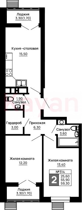 Продажа 2-комн. квартиры, 55.9 кв.м