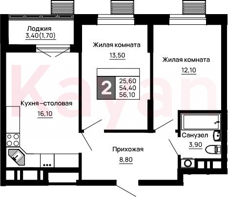 Квартира в ЖК «Традиции» (ССК. Краснодарский край) литер 1 очередь 1, Монолитный, 2 к.кв., 54.4 кв.м., 15/16, высота потолков: 2.72 м, жилая площадь: 25.6 кв.м., возможна ипотека, площадь кухни 16.1 кв.м.,