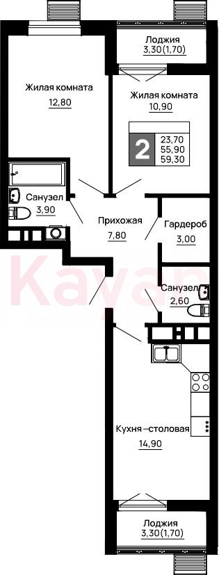 Продажа 2-комн. квартиры, 55.9 кв.м