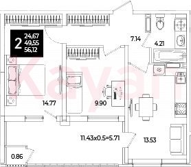 Продажа 2-комн. квартиры, 49.55 кв.м