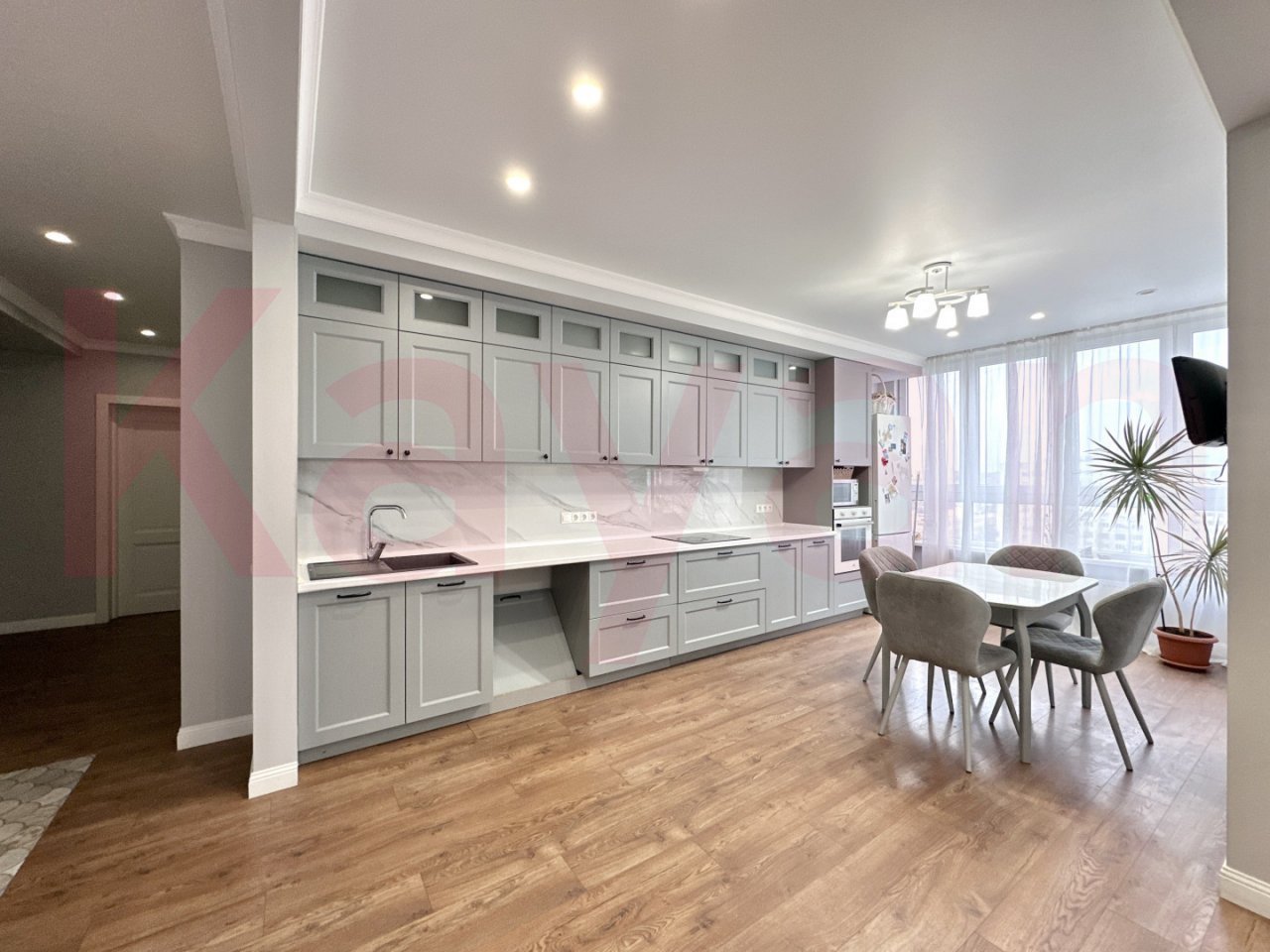 Функциональная кухня укомплектована встроенной техникой. Кухня плавно переходит в гостиную, в которой выделена обеденная зона и зона отдыха.