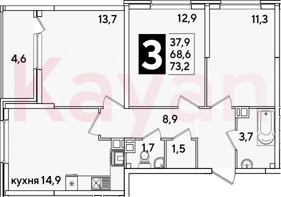 Продажа 3-комн. квартиры, 68.6 кв.м