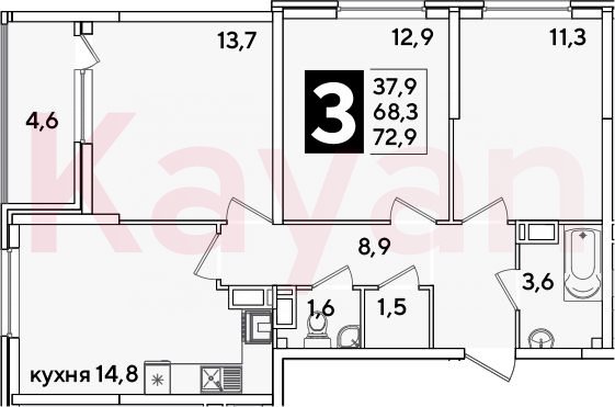 Продажа 3-комн. квартиры, 68.3 кв.м