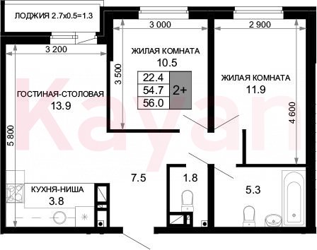 Квартира в ЖК Дыхание (ССК. Краснодарский край) литер 27 очередь 6, Кирпично-монолитный, 3 к.кв., 54.7 кв.м., 11/16, высота потолков: 2.7 м, жилая площадь: 22.4 кв.м., возможна ипотека, площадь кухни 17.7 кв.м.,