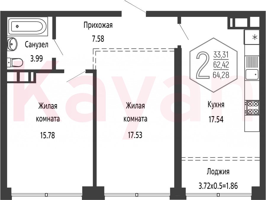 Квартира в ЖК «Гарантия на Обрывной» (Гарантия) литер 4 очередь 2, Кирпично-монолитный, 3 к.кв., 62.42 кв.м., 18/24, высота потолков: 2.74 м, жилая площадь: 33.31 кв.м., возможна ипотека, площадь кухни 17.54 кв.м.,