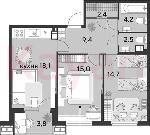 Квартира в ЖК «Парк Победы» (DOGMA. Краснодар) литер 30 очередь 2, Кирпично-монолитный, 3 к.кв., 66.3 кв.м., 3/9, высота потолков: 2.72 м, жилая площадь: 29.7 кв.м., возможна ипотека, возможна военная ипотека, площадь кухни 18.1 кв.м.,