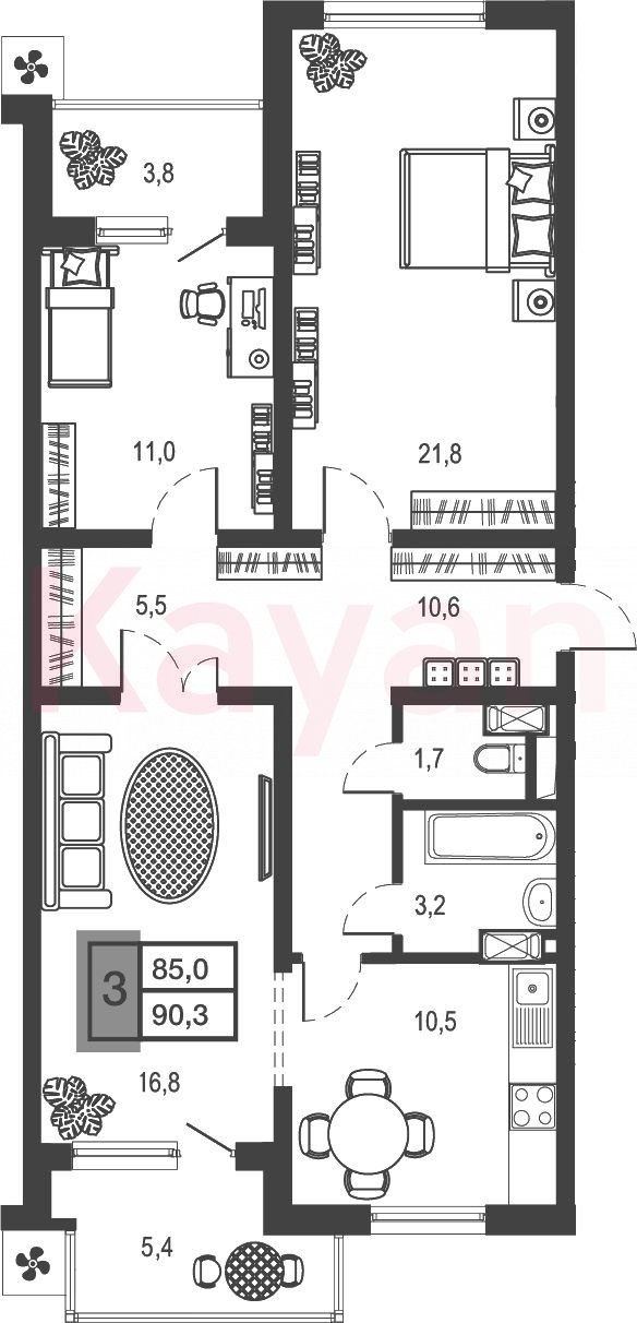 В проекте представлено множество планировочных решений: от 1-комнатных до 3х-комнатных квартир с собственным балконом или лоджией. На первом этаже здания располагаются апартаменты с отдельным входом и увеличенными окнами и потолками 3,3 метра. Из комплекса открывается вид на Карасунские озера.