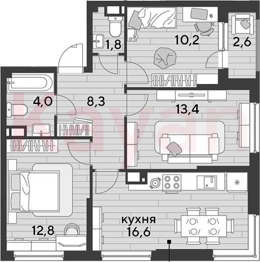 Квартира в ЖК «Dogma park (Догма парк)» (DOGMA. Краснодар) литер 15 очередь 2, Кирпично-монолитный, 3 к.кв., 67.1 кв.м., 13/16, высота потолков: 2.72 м, жилая площадь: 36.4 кв.м., возможна ипотека, возможна военная ипотека, площадь кухни 16.6 кв.м.,