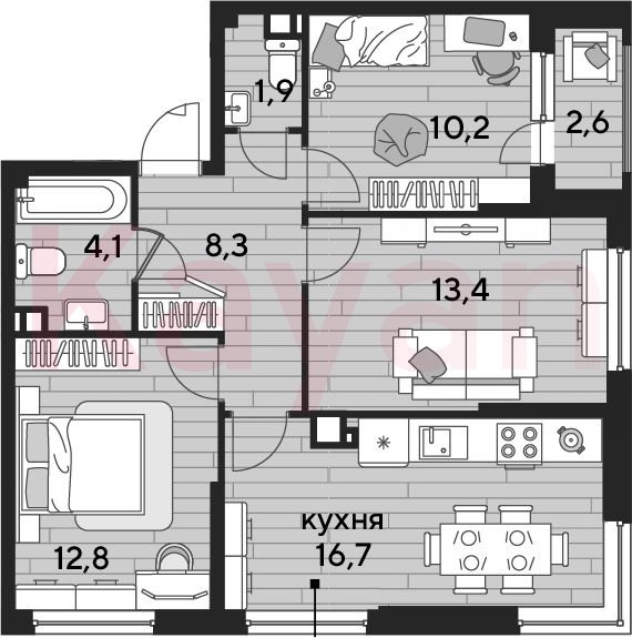 Квартира в ЖК «Dogma park (Догма парк)» (DOGMA. Краснодар) литер 18 очередь 2, Кирпично-монолитный, 3 к.кв., 67.4 кв.м., 6/16, высота потолков: 2.72 м, жилая площадь: 36.4 кв.м., возможна ипотека, возможна военная ипотека, площадь кухни 16.7 кв.м.,