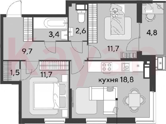 Продажа 3-комн. квартиры, 59.4 кв.м