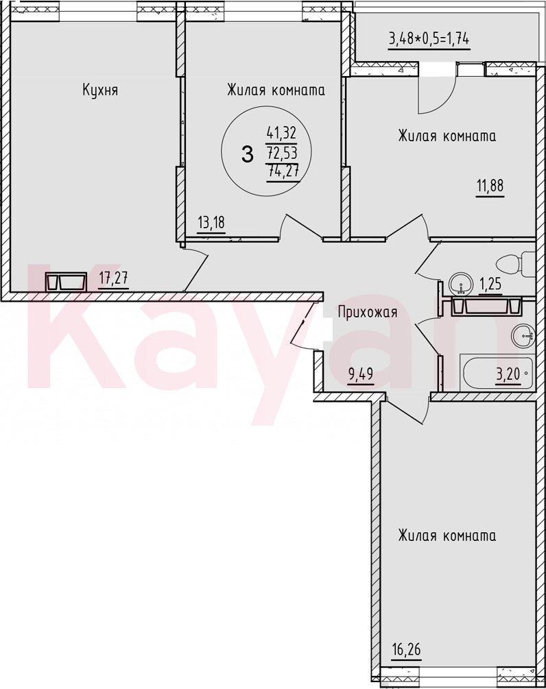 Продажа 3-комн. квартиры, 72.53 кв.м