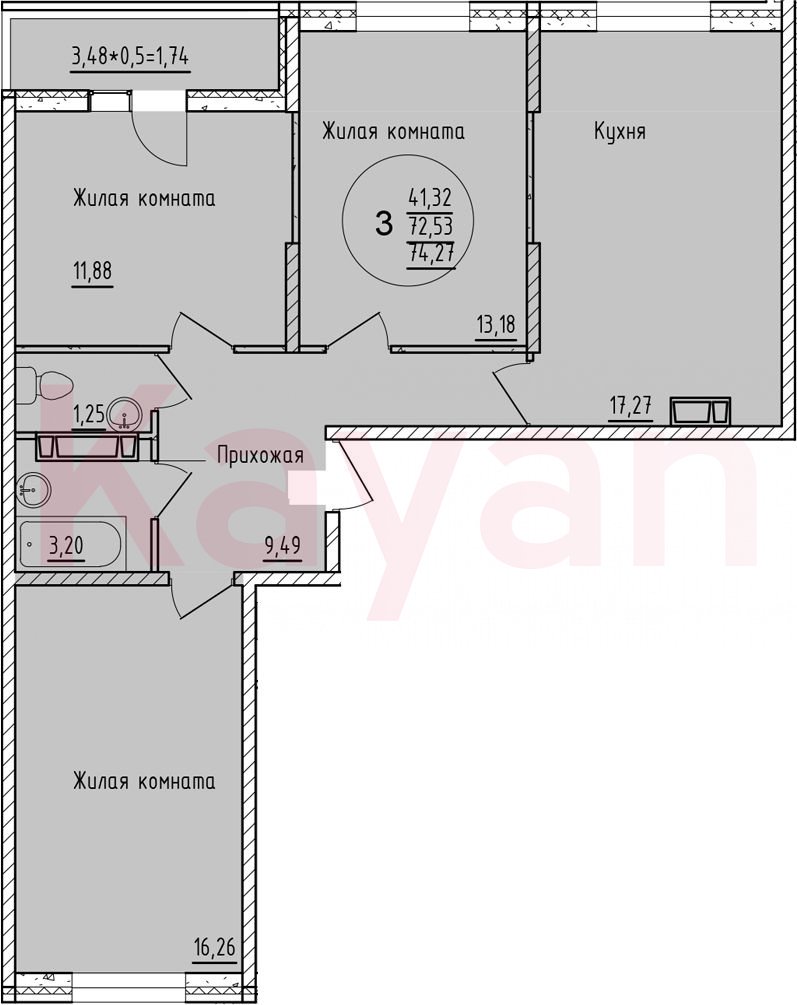 Продажа 3-комн. квартиры, 72.53 кв.м