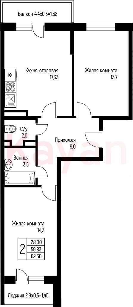 Продажа 3-комн. квартиры, 59.83 кв.м
