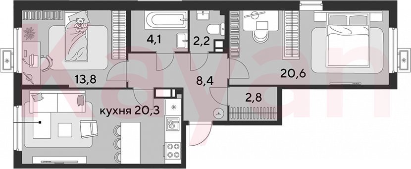 Квартира в ЖК «Парк Победы» (DOGMA. Краснодар) литер 6 очередь 2, Кирпично-монолитный, 3 к.кв., 72.2 кв.м., 10/18, высота потолков: 2.72 м, жилая площадь: 34.4 кв.м., возможна ипотека, возможна военная ипотека, площадь кухни 20.3 кв.м.,