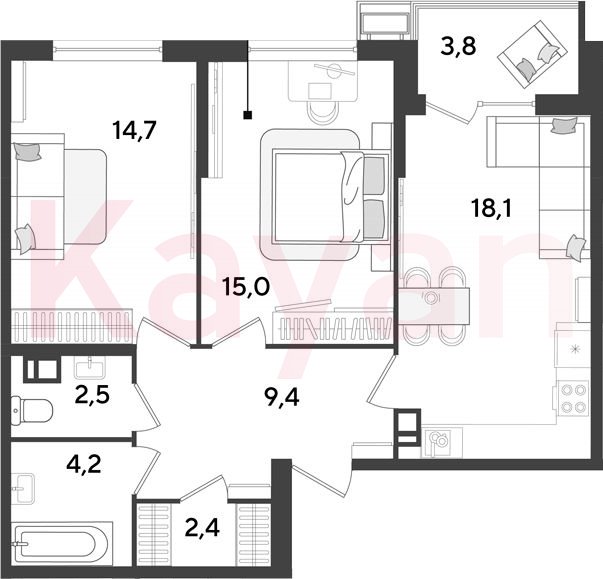 Квартира в ЖК «Парк Победы» (DOGMA. Краснодар) литер 7 очередь 2, Кирпично-монолитный, 3 к.кв., 66.3 кв.м., 5/9, высота потолков: 2.72 м, жилая площадь: 29.7 кв.м., возможна ипотека, возможна военная ипотека, площадь кухни 18.1 кв.м.,