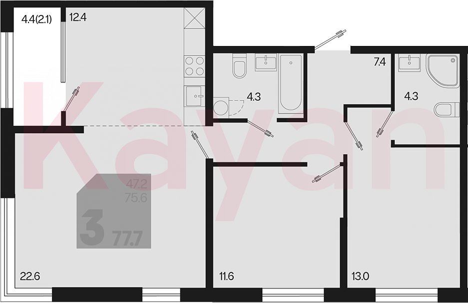 Продажа 3-комн. квартиры, 75.6 кв.м