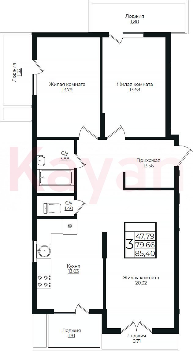 Продажа 3-комн. квартиры, 79.66 кв.м