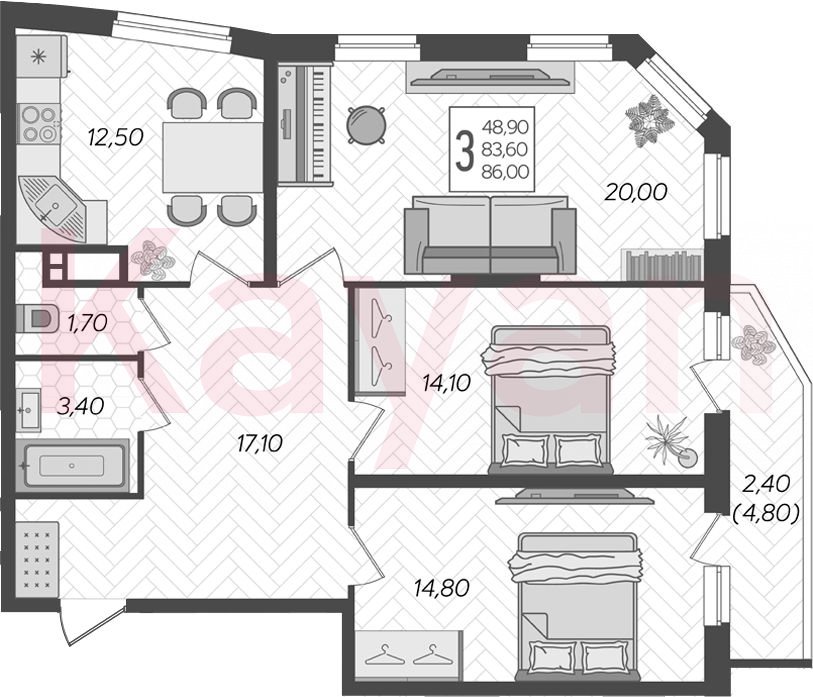 Продажа 3-комн. квартиры, 83.6 кв.м