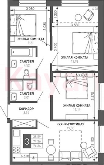 Продажа 3-комн. квартиры, 74.36 кв.м