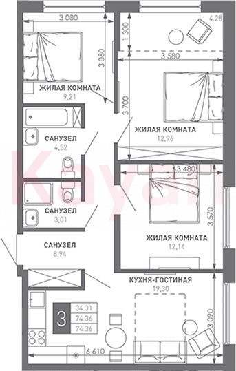 Продажа 3-комн. квартиры, 74.36 кв.м