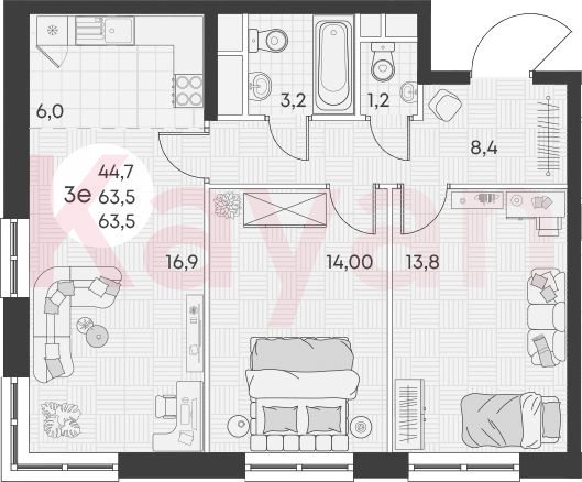 Квартира в ЖК «Green Apple» (БЭЛ-Девелопмент) литер 1 очередь 1, Кирпично-монолитный, 3 к.кв., 63.5 кв.м., 9/14, высота потолков: 2.8 м, жилая площадь: 27.8 кв.м., возможна ипотека, площадь кухни 22.9 кв.м.,