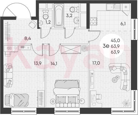 Квартира в ЖК «Green Apple» (БЭЛ-Девелопмент) литер 1 очередь 1, Кирпично-монолитный, 3 к.кв., 63.9 кв.м., 11/16, высота потолков: 2.8 м, жилая площадь: 28 кв.м., возможна ипотека, площадь кухни 23.1 кв.м.,