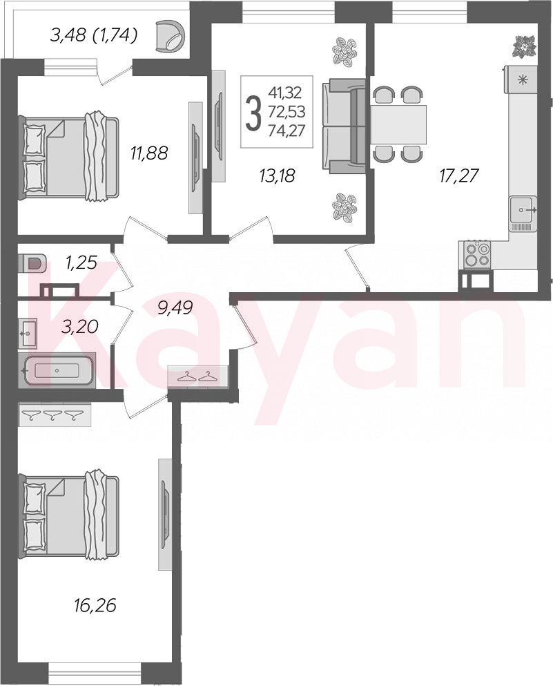 Продажа 3-комн. квартиры, 72.53 кв.м