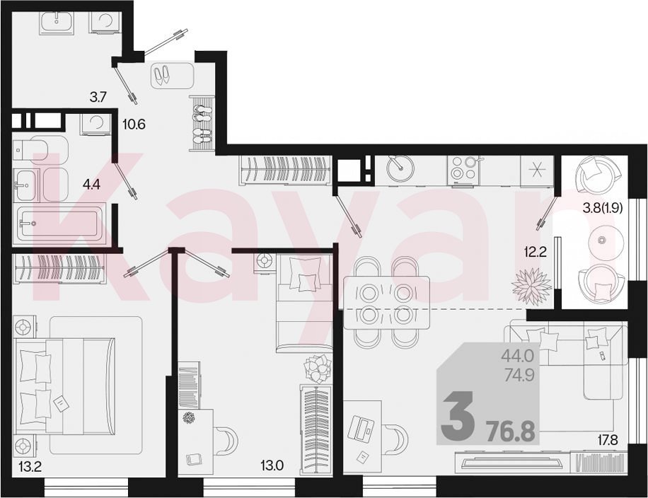 Продажа 3-комн. квартиры, 74.9 кв.м