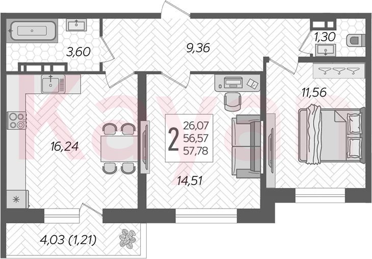Квартира в ЖК «Смородина» (AVA Краснодар) литер 17 очередь 2, Кирпично-монолитный, 3 к.кв., 56.57 кв.м., 11/12, высота потолков: 2.75 м, жилая площадь: 26.07 кв.м., возможна ипотека, площадь кухни 16.24 кв.м.,