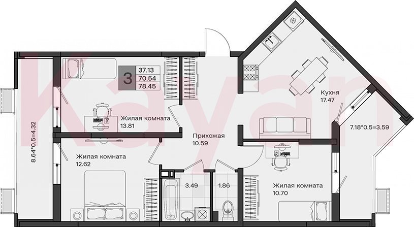 Продажа 3-комн. квартиры, 70.54 кв.м