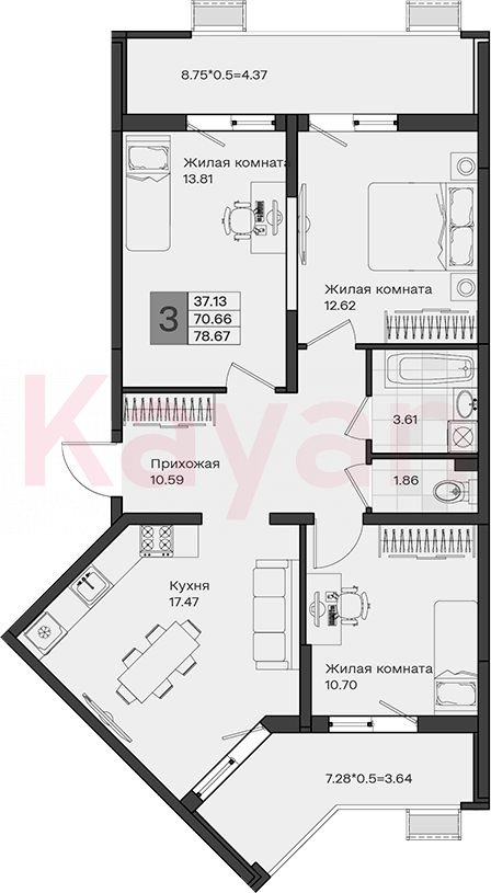 Продажа 3-комн. квартиры, 70.66 кв.м