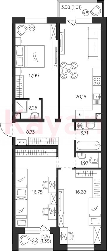 В проекте представлены планировки от 1 до 3-комнатных квартир. Сдаются они с отделкой White Box, высотой потолков 2.7 метров и стандартными окнами. На лоджиях и балконах выполнено панорамное остекление.