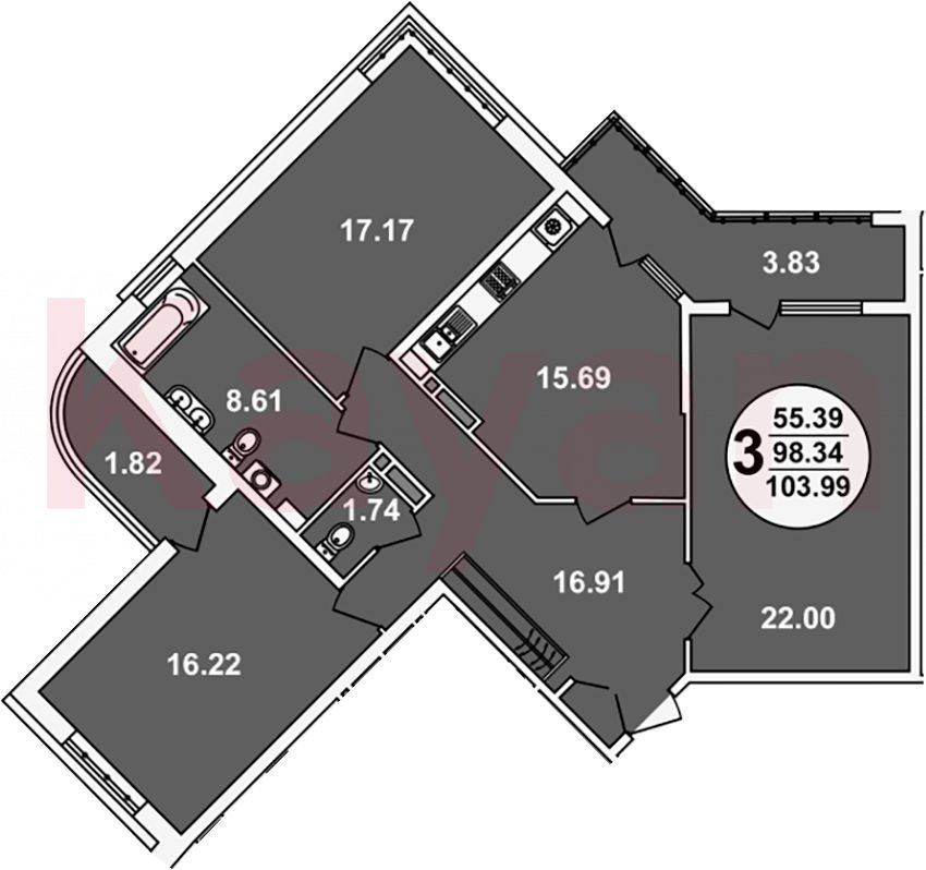 Квартира в ЖК «Краснодар сити» (Юг-Инжиниринг) литер 3 очередь 1, Газобетон-монолит, 3 к.кв., 98.34 кв.м., 20/23, высота потолков: 2.75 м, жилая площадь: 55.39 кв.м., возможна ипотека, возможна военная ипотека, площадь кухни 15.69 кв.м.,