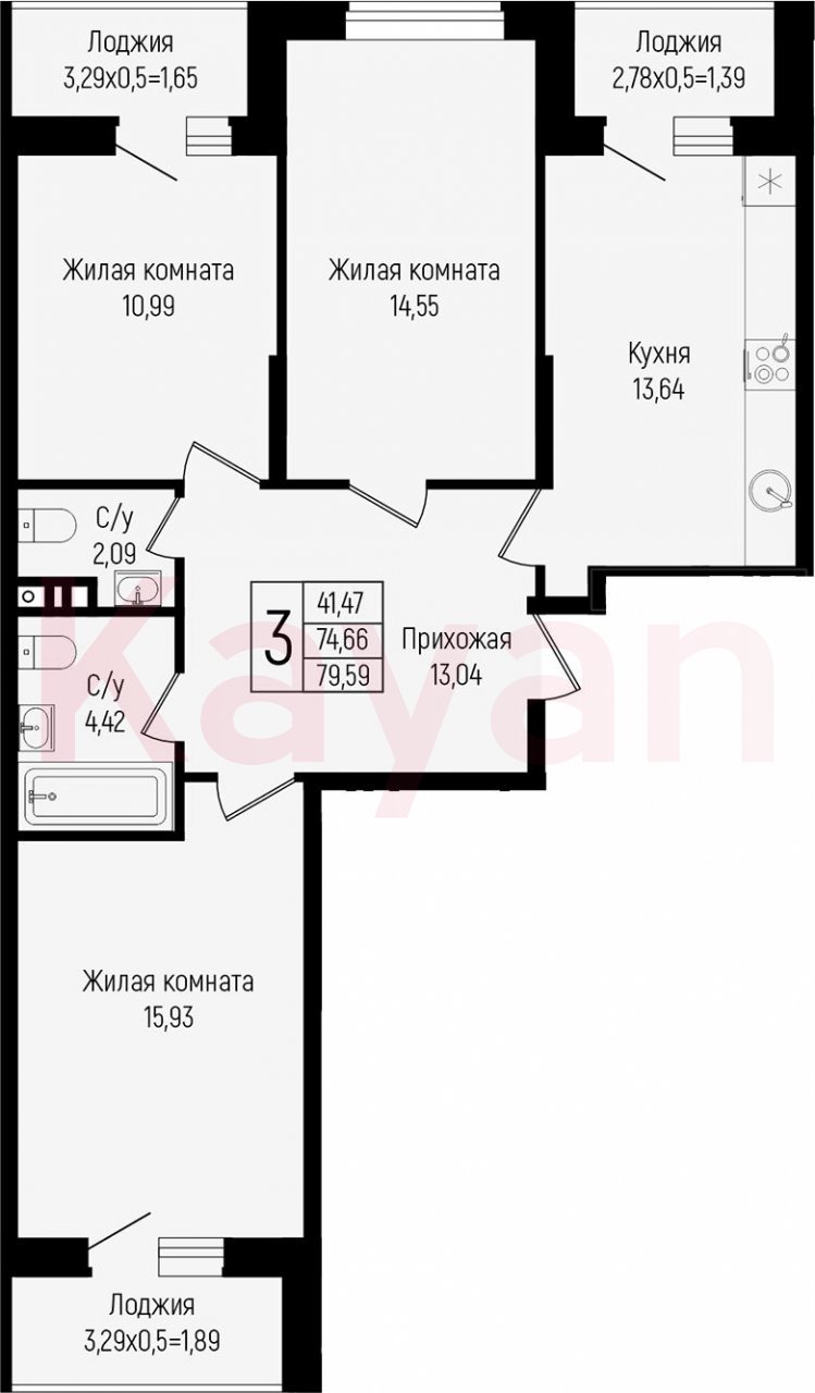 Продажа 3-комн. квартиры, 74.66 кв.м