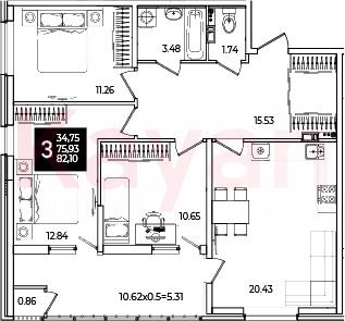 Продажа 3-комн. квартиры, 75.93 кв.м