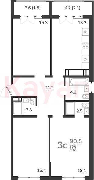 Квартира в ЖК Все свои (Семья) литер 4 очередь 4, Газобетон-монолит, 4 к.кв., 86.6 кв.м., 13/24, высота потолков: 2.7 м, жилая площадь: 50.8 кв.м., возможна ипотека, площадь кухни 15.2 кв.м.,