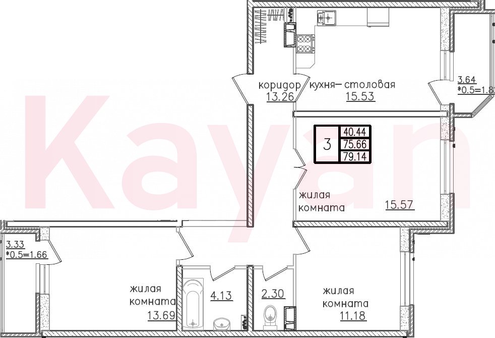 Квартира в ЖК «‎Ural» (AVA Краснодар) литер 1 очередь 1, Кирпично-монолитный, 4 к.кв., 75.66 кв.м., 9/23, высота потолков: 2.7 м, жилая площадь: 40.44 кв.м., возможна ипотека, площадь кухни 15.53 кв.м.,