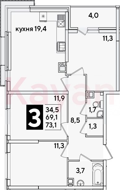 Квартира в ЖК Самолет (DOGMA. Краснодар) литер 54 очередь 6, Кирпично-монолитный, 4 к.кв., 69.1 кв.м., 9/16, высота потолков: 2.89 м, жилая площадь: 34.5 кв.м., возможна ипотека, возможна военная ипотека, площадь кухни 19.4 кв.м.,