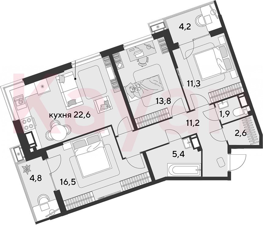 Квартира в ЖК «Парк Победы» (DOGMA. Краснодар) литер 21 очередь 2, Кирпично-монолитный, 4 к.кв., 85.3 кв.м., 10/18, высота потолков: 2.72 м, жилая площадь: 41.6 кв.м., возможна ипотека, возможна военная ипотека, площадь кухни 22.6 кв.м.,