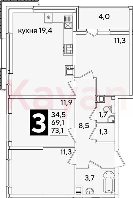 Квартира в ЖК Самолет (DOGMA. Краснодар) литер 47 очередь 6, Кирпично-монолитный, 4 к.кв., 69.1 кв.м., 7/16, высота потолков: 2.89 м, жилая площадь: 34.5 кв.м., возможна ипотека, возможна военная ипотека, площадь кухни 19.4 кв.м.,
