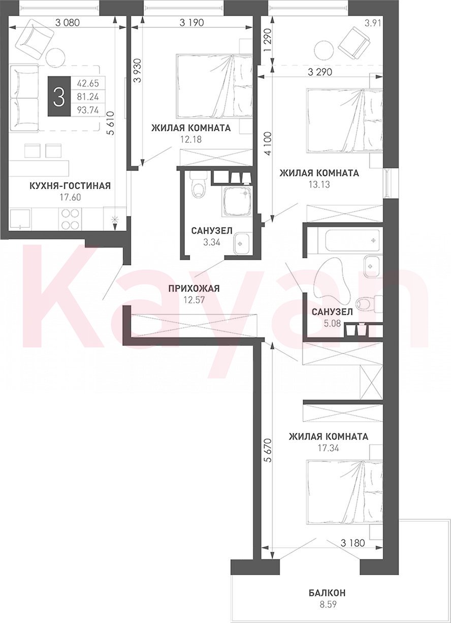 Квартира в ЖК «Иначе в Молодежном» (ГК Иначе) литер 1 очередь 1, Монолитный, 4 к.кв., 81.24 кв.м., 5/9, высота потолков: 2.7 м, жилая площадь: 42.65 кв.м., возможна ипотека, площадь кухни 17.6 кв.м.,