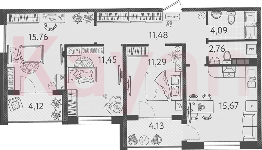 Квартира в ЖК «Друзья» (Семья) литер 6 очередь 2, Монолитный, 4 к.кв., 72.5 кв.м., 4/9, высота потолков: 2.85 м, жилая площадь: 38.5 кв.м., возможна ипотека, возможна военная ипотека, площадь кухни 15.67 кв.м.,