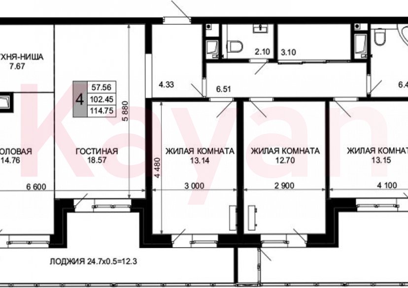 Квартира в ЖК «Рекорд» (DOGMA. Краснодар) литер 1 очередь 3, Кирпично-монолитный, 5 к.кв., 101.6 кв.м., 23/24