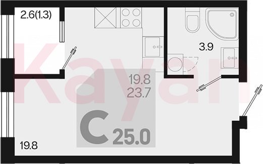 Квартира в ЖК «Первое место» (ГК Точно. Краснодарский край) литер 1.3. Л1 очередь 1, Монолитный, студия, 23.7 кв.м., 2/18, высота потолков: 2.66 м, жилая площадь: 19.8 кв.м., возможна ипотека, возможна военная ипотека, площадь кухни 0 кв.м.,